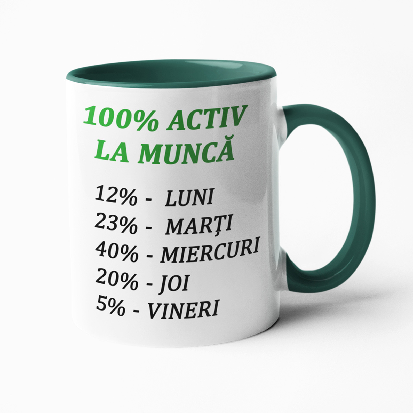 Cană personalizată 100% Activ La Muncă este o cană cu un mesaj funny. O poți folosi la muncă sau o poți oferi cadou colegilor, prietenilor sau unei persoane care are ”faima” de a fi activ la muncă…sau nu.